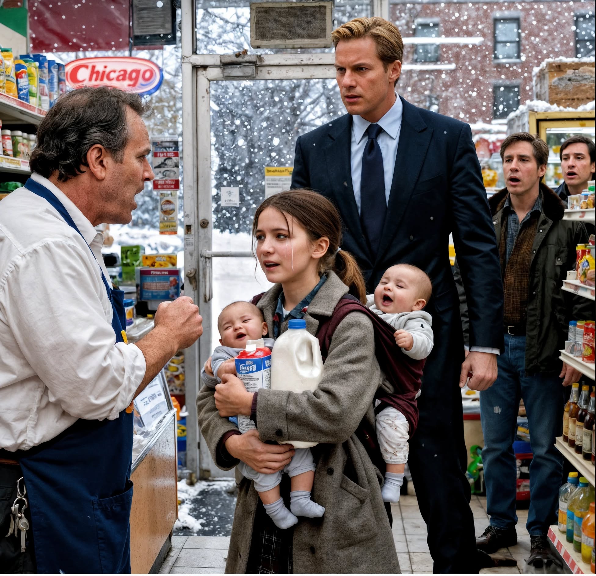 At that moment, a tall man wearing a dark wool coat took a step forward. “Wait,” he said calmly but firmly. Everyone recognized him at once—Daniel Whitmore, a well-known real estate developer in the neighborhood. “How much is the milk?” he asked. Mr. Roberts blinked. “Two dollars,” he replied. Daniel took out his wallet, handed him a twenty-dollar bill, and added, “Hold the change.” Then he turned to Emily. “Come on,” he said softly.