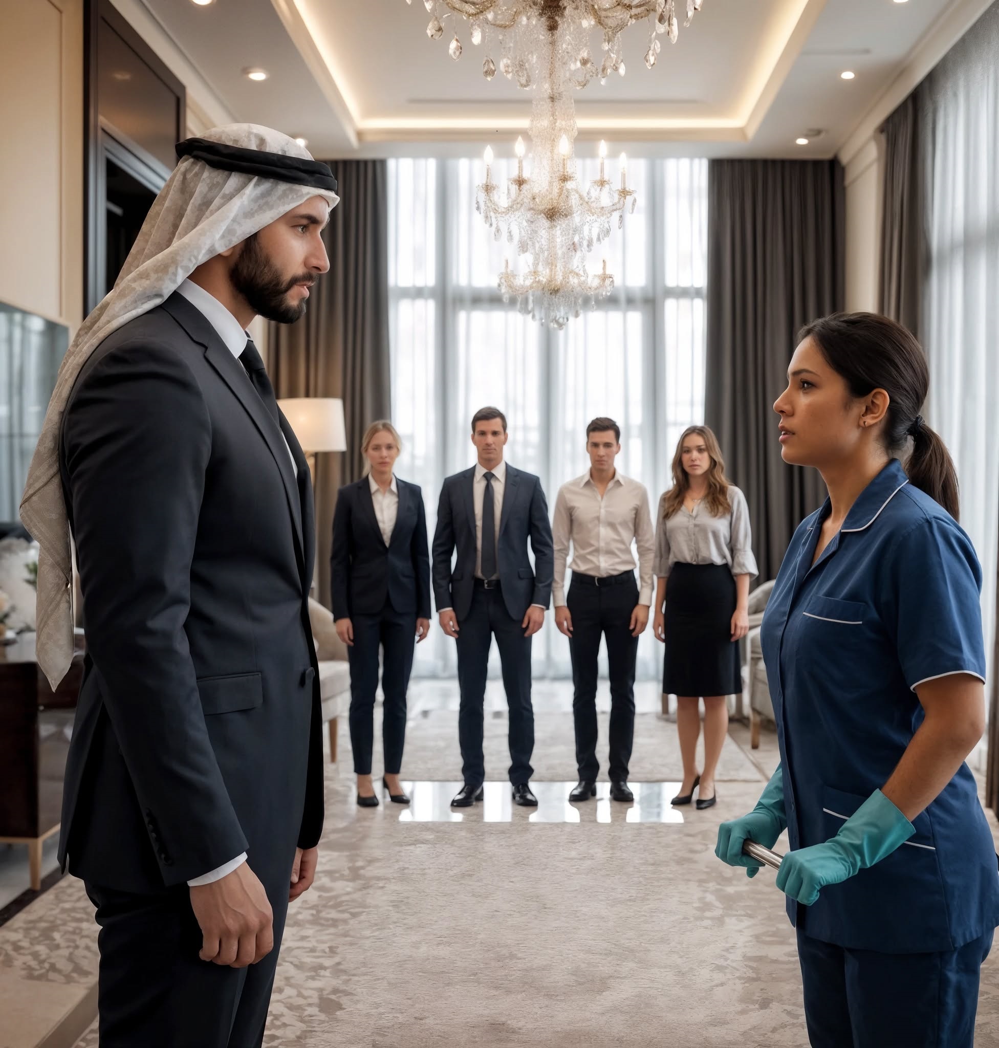 The sheikh stopped. Not in front of the headmistress, but in front of the cleaning cart. He observed the meticulous order, the bottles lined up, the cloth hanging like a weary whip. The silence lasted just long enough for Lucía’s heart to beat twice, strongly.