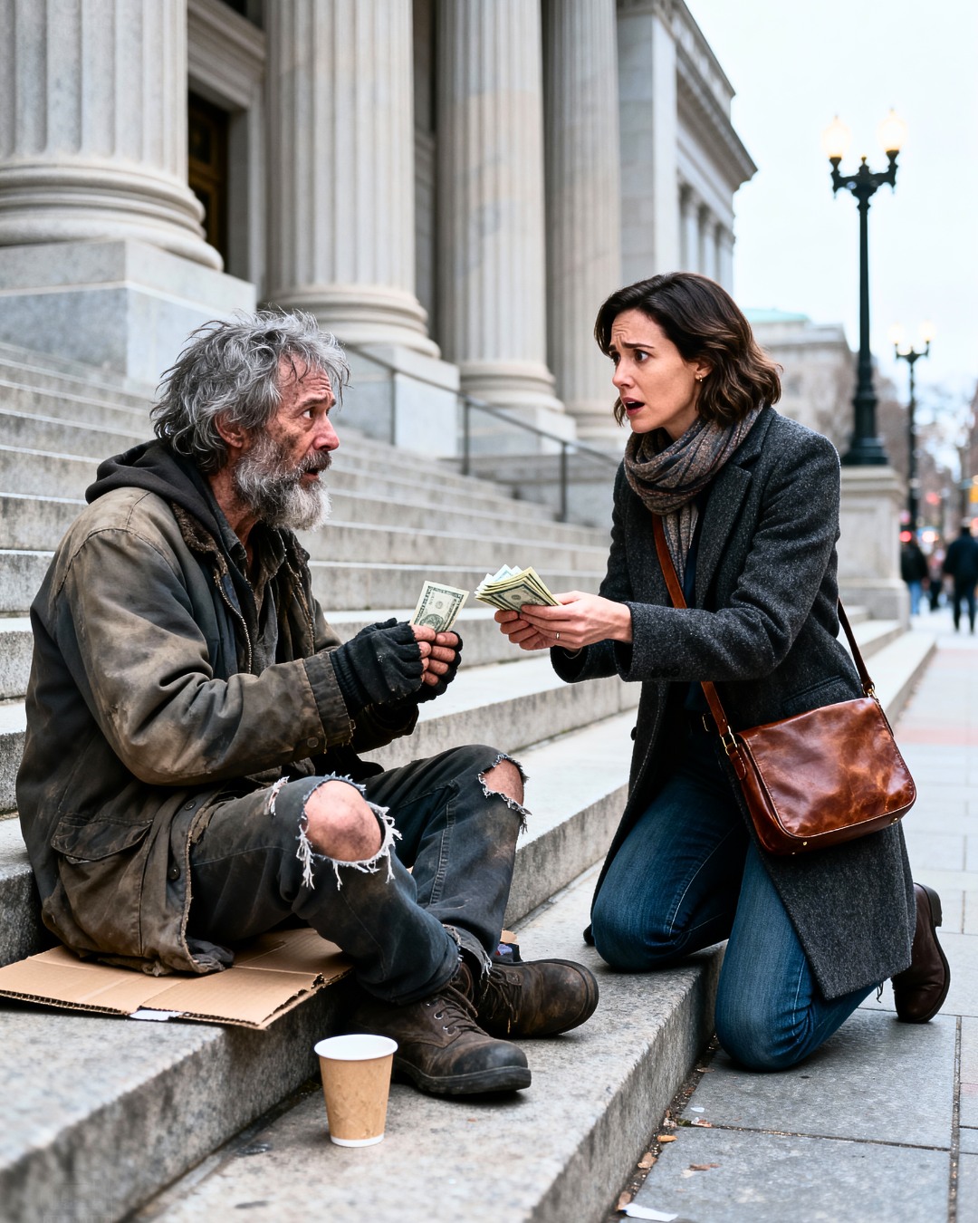 After my husband died three years ago, I pushed myself back into a routine before the grief could drown me. I found a new job as a receptionist at a dental office across the city, and every morning I passed the old community library where an elderly homeless man named Harold sat on the same bench with his worn backpack and a cardboard sign that read, “I’m still trying.” That simple message always caught at my heart. So each day, without fail, I bent down, set a few folded bills beside him, shared a small smile, and continued toward the bus stop. Harold never asked for anything. He just nodded, grateful but exhausted. It became a quiet ritual—steady, familiar, almost like speaking to my late husband before leaving the house. It softened the edges of the world. One cold Thursday evening in early November, I was running late. The sun had vanished behind the buildings when I stepped toward Harold, reaching for the money I had set aside. I bent down as always—but this time, he reached out and gripped my wrist with startling force. “Ma’am,” he whispered urgently, scanning the street as if someone might be listening. “You’ve been too kind to me. Too kind. Don’t go home tonight.” I froze. His voice shook—not from the chill, but from something heavier. “Harold, what—?” “Please,” he insisted, tightening his hold just for a second before letting go. “Don’t go home. Stay somewhere else. Tomorrow, I’ll show you this.” He tapped the front pocket of his jacket. Something inside was flat, rectangular, wrapped in plastic. A cold ripple slid through me. People walked around us as though nothing unusual was happening, but the world felt tilted. “Harold… tell me what’s happening.” He shook his head. “Tomorrow,” he said again. “Just promise me you won’t sleep at your house tonight.” His cracked, pleading voice lodged itself in my chest. And standing on those library steps, I felt my ordinary life shift into something unfamiliar. I told myself it was absurd to take warning from a man who barely had enough to eat. But his urgency followed me to the bus stop, onto the bus, and all the way to my neighborhood. His words kept echoing: Don’t go home tonight. When I reached my street, my heart was thudding. My house looked normal—dark, quiet, full of memories and grief. I stood there for a long moment, my key cold in my hand. Then, without understanding why, I turned away and walked to a small motel a couple of blocks over. Sleep barely came. Every sound jolted me awake. At dawn, after a lukewarm shower and a cup of weak motel coffee, I headed back toward the library. Harold was already there, sitting upright with a seriousness I had never seen on him. When he saw me, he rose slowly and beckoned me closer. “You listened,” he murmured, relief softening his features. “Now tell me why,” I said. He reached into the pocket he had tapped the night before and pulled out a small plastic envelope. Inside was an old photograph and a folded newspaper clipping. He handed them to me. “Your husband,” he said softly. “I knew him.” My breath stalled. The photo showed Harold—clean-shaven, younger—and my husband Daniel, shaking hands in front of a building I didn’t recognize. “What is this?” I whispered. “I worked with him once,” Harold explained. “Before my life went wrong. He helped me. Told me that if I ever needed to repay him, I should protect the people he loved. I didn’t realize you were his wife until a few weeks ago. I recognized your last name on your badge.” My hands shook. “Protect me from what?” He pointed to the newspaper clipping. It described a break-in at a house—my house—back when Daniel was still alive. He had never told me. The intruder had never been caught. Police suspected he was searching for something specific. “They came back last night,” Harold said grimly. “I saw the same man watching your place. Same face from years ago. That’s why I begged you not to go home.” The ground felt unsteady beneath me. “What does he want?” I managed. “Whatever Daniel hid—and whatever he died trying to protect,” Harold said simply. Pieces I never knew existed began falling into place. Daniel had always carried a quiet weight. I’d thought it was work. Maybe it was something far darker. “We have to call the police,” I said. “We will,” Harold replied. “But first, you need to see what he left.” He led me around the library to a rusted storage shed. Beneath broken shelves and dusty boxes, he revealed a small metal container. “Daniel gave this to me,” Harold said. “Told me not to open it—only to give it to his wife if anything ever happened.” My throat tightened. “Why wait until now?” He lowered his gaze. “Shame,” he admitted. “And I hoped the danger had passed.” He placed the container in my hands. It was heavier than it looked. Inside were documents—statements, letters, receipts—and a USB drive. On top lay a note in Daniel’s handwriting: If you’re reading this, I couldn’t stop the truth from reaching you. I’m sorry. Protect yourself. Trust the man who brings this to you. Beneath it was a report linking a local developer—Marshall Kane—to fraud, intimidation, and families forced from their homes. Daniel had been gathering evidence, planning to expose him. The same man had been campaigning for a huge project in our neighborhood. “He came to your house last night,” Harold said. “He thinks whatever Daniel hid is still there.” A steadiness settled inside me. “We’re going to the police. Right now.” “I’ll go with you,” Harold said. And together we walked—bound by grief, loyalty, and a promise that had waited too long.