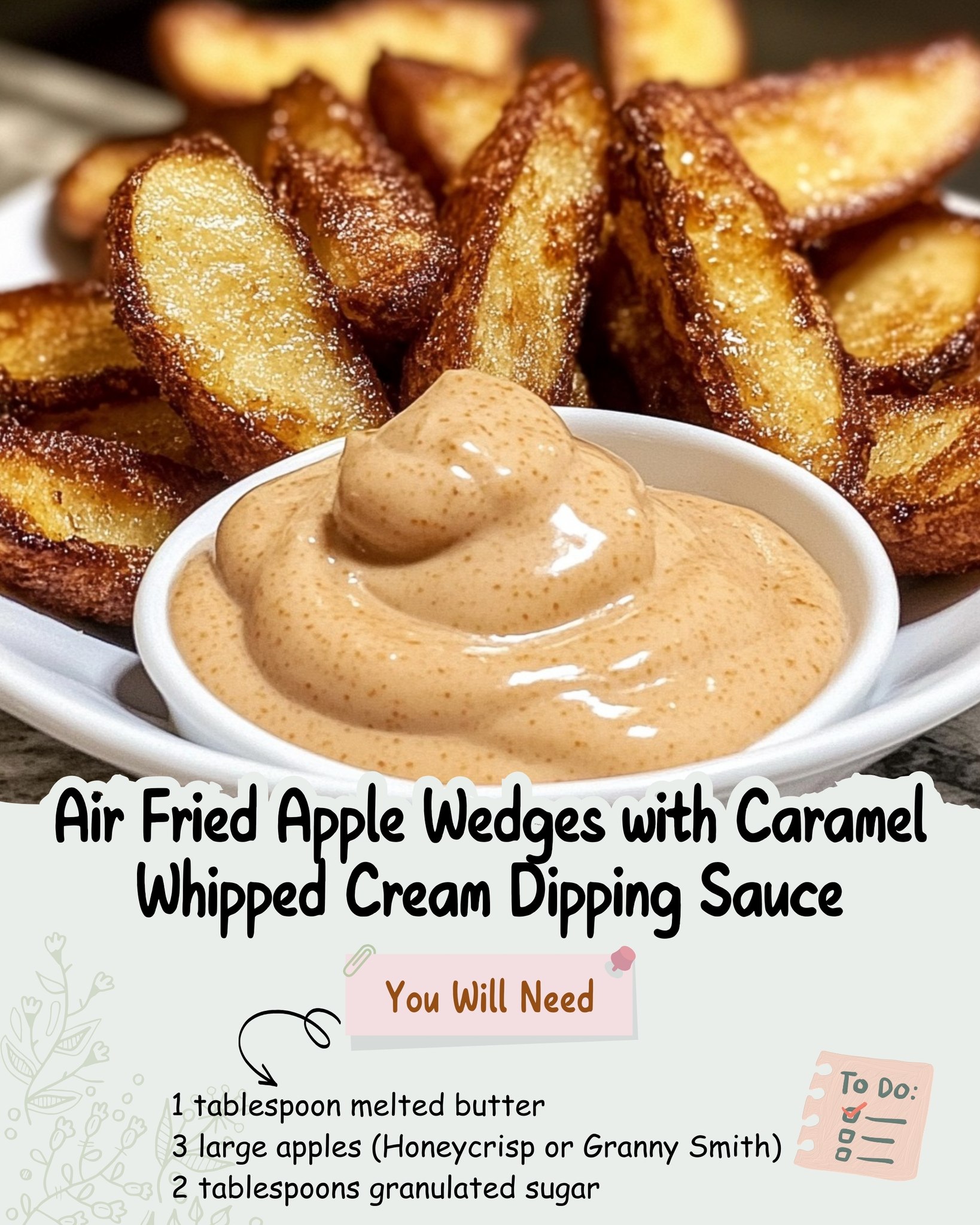 These Air Fried Apple Wedges are the perfect fall-inspired treat—warm, cinnamon-kissed apples with a crisp exterior and tender center, paired with a dreamy caramel whipped cream dipping sauce. A quick and easy dessert or snack with all the cozy vibes!