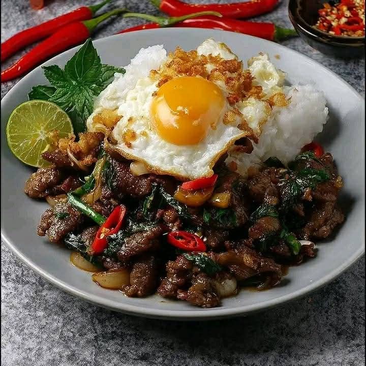 Pad Kaprow, or Thai Basil Chicken, is one of Thailand’s most beloved street food dishes—quick to make yet bursting with bold, aromatic flavors. This version features tender minced chicken stir-fried with garlic, chili, and a blend of savory sauces, finished with the unmistakable fragrance of Thai holy basil. Topped with a crispy fried egg and served over steaming jasmine rice, it’s the perfect balance of heat, sweetness, and umami in every bite.