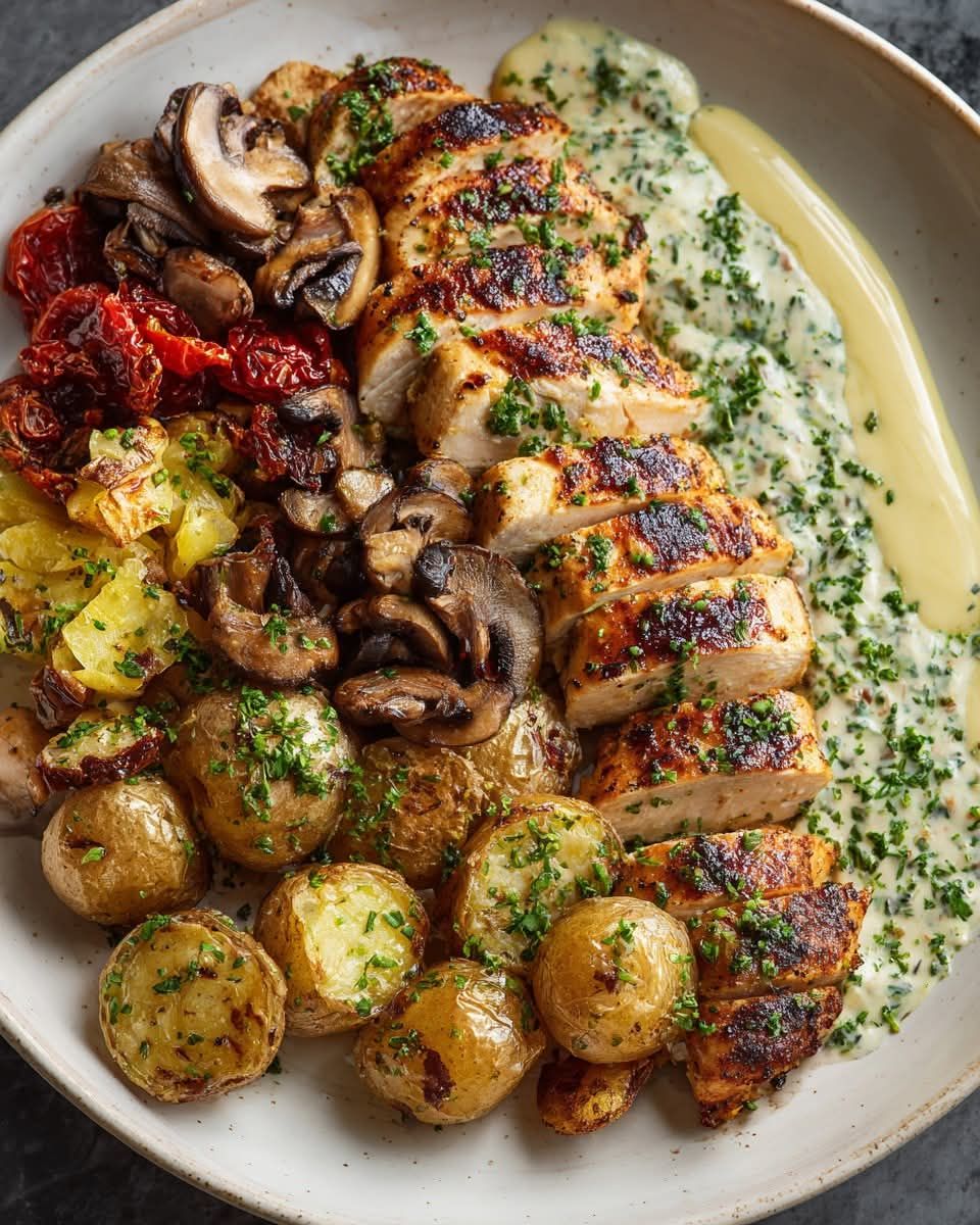 🍽️ This Bistro-Style Herb Chicken brings together golden seared chicken breasts, roasted baby potatoes, garlicky mushrooms, and a silky herb crème fraîche sauce. It’s the kind of satisfying yet refined dish you’d expect at a cozy French bistro — and it’s simple enough to make at home in under an hour.