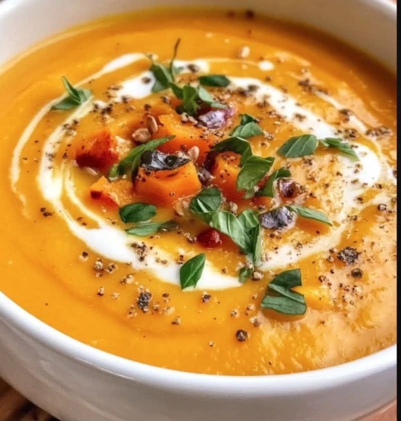 Butternut Squash Soup — creamy, comforting, and full of cozy fall flavor! This velvety soup blends roasted butternut squash with savory aromatics and vegetable broth for a smooth, naturally sweet, and satisfying meal. Perfect for chilly days or as a festive starter! 🍂🥣✨