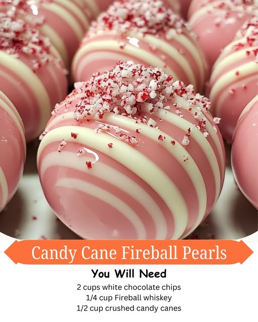 These festive Candy Cane Fireball Pearls blend creamy white chocolate with a warm cinnamon kick from Fireball whiskey, creating a rich, ganache-like center coated in crisp peppermint candy. Their smooth texture and bright candy shell make them perfect for holiday parties or edible gifting.