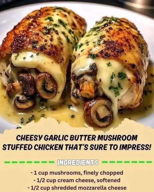 Juicy chicken breasts stuffed with a rich blend of mushrooms, cream cheese, and mozzarella, then seared in garlic butter and baked to perfection — this Cheesy Garlic Butter Mushroom Stuffed Chicken is pure comfort food elegance. It’s creamy, flavorful, and perfect for dinner when you want something impressive yet easy to make.