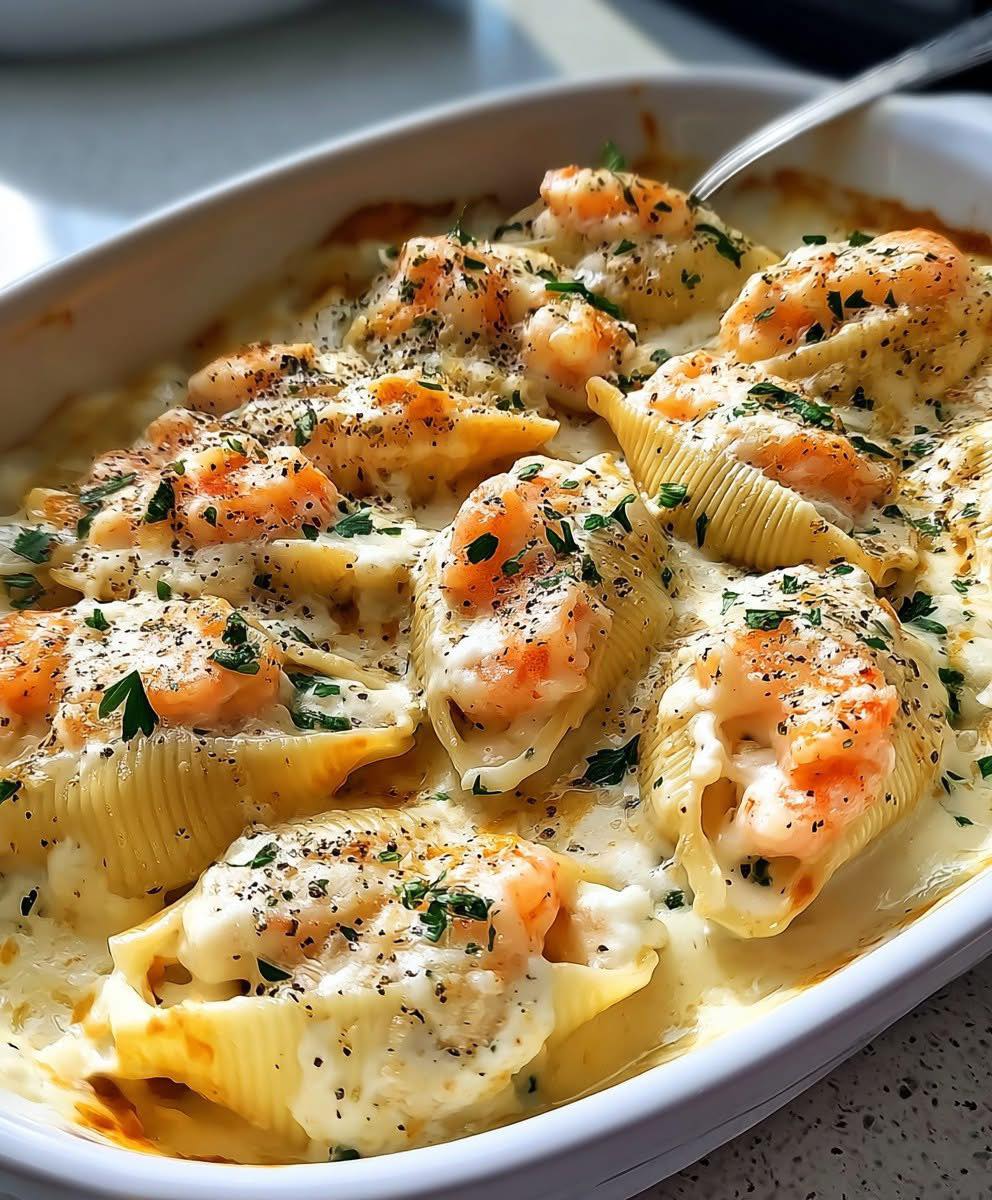 🧀🍤 Cheesy Shrimp Alfredo Stuffed Shells — Creamy, Dreamy, and Irresistible! 💛