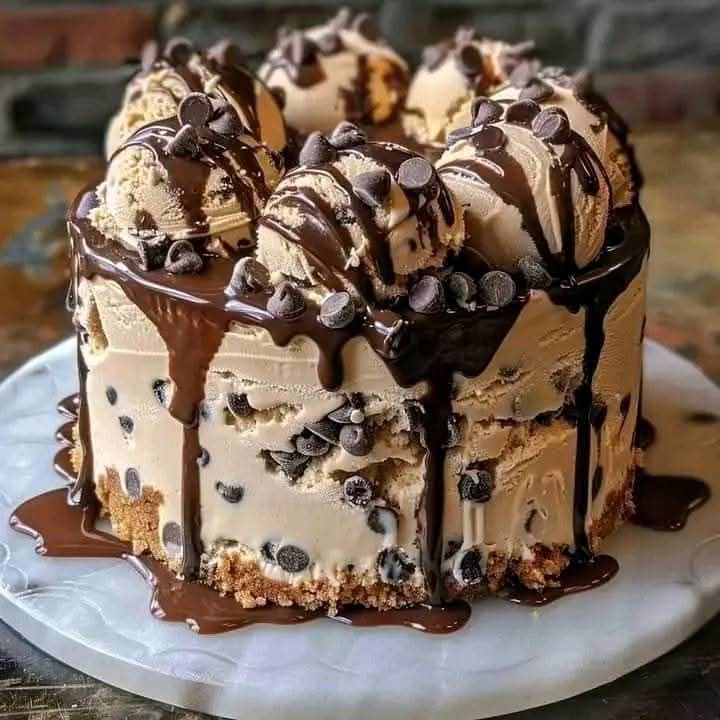 Chocolate Chip Cookie Dough Ice Cream Cake — a dreamy no-bake dessert that combines a rich chocolate cookie crust, layers of creamy cookie dough ice cream, and a glossy chocolate ganache. Finished with extra ice cream scoops and chocolate chips, it’s the ultimate showstopper for birthdays or celebrations! 🎂🍫🍪