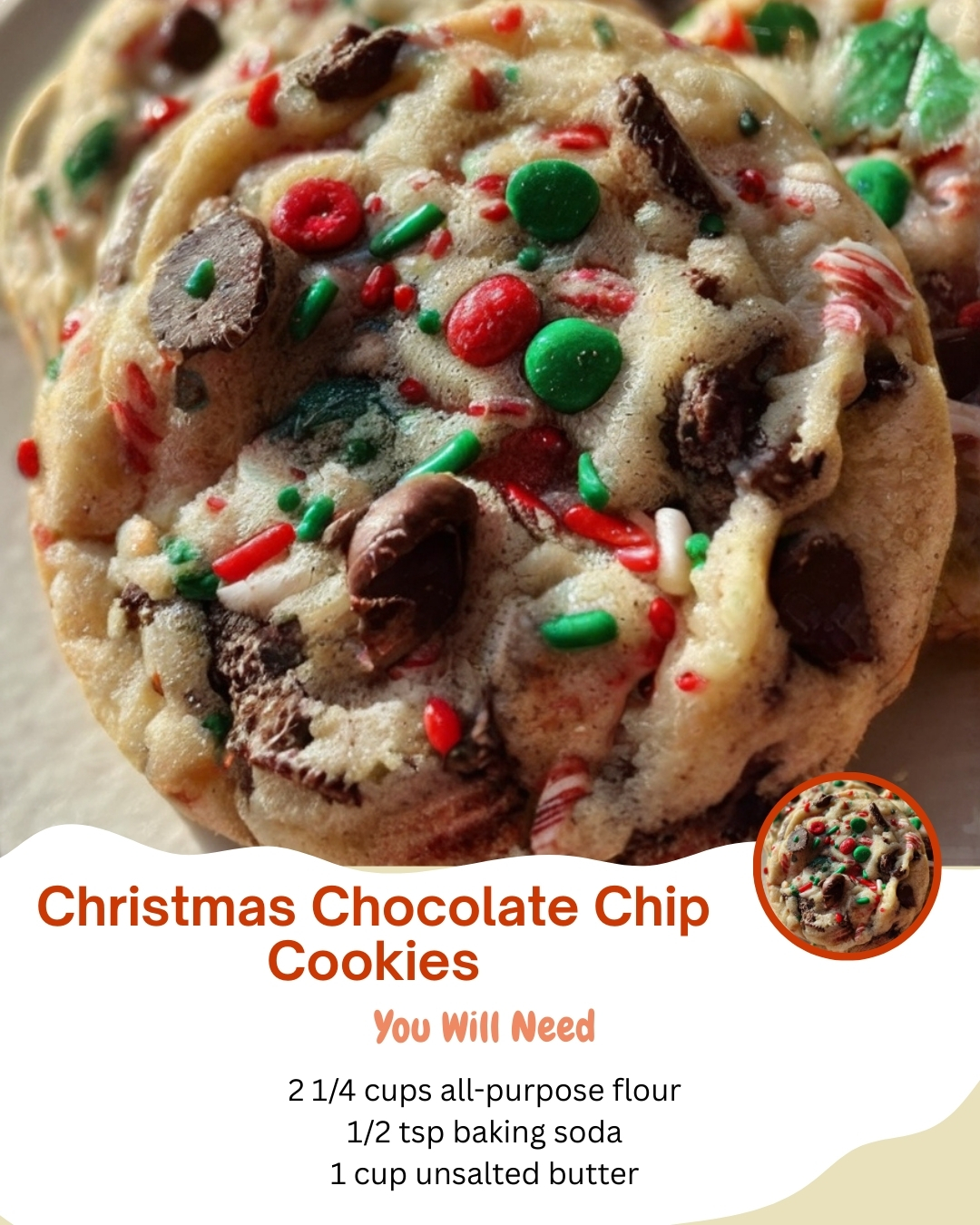These festive Christmas chocolate chip cookies combine a classic soft–centered, golden-edged dough with cheerful red and green sprinkles baked throughout. The result is a cozy holiday treat with familiar buttery sweetness, subtle vanilla warmth, and plenty of melty chocolate in every bite.