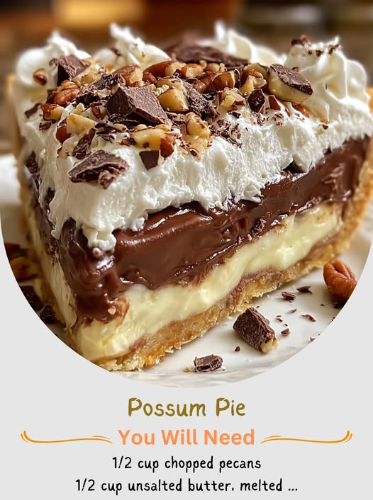 Possum Pie is a beloved Southern dessert that’s as playful as its name. No actual possums involved—just decadent layers of buttery pecan crust, sweetened cream cheese, creamy chocolate and vanilla pudding, and whipped topping. It’s a chilled, crowd-pleasing treat perfect for potlucks, holidays, or any time you crave something cool, creamy, and chocolatey.