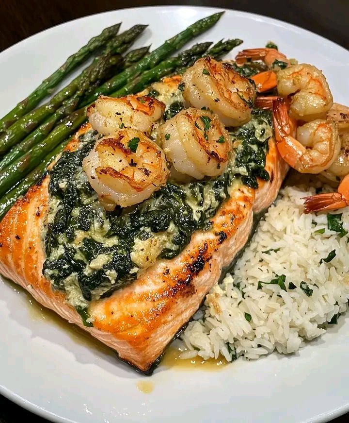 This Creamy Spinach-Stuffed Salmon topped with juicy garlic shrimp and served with roasted asparagus and rice is a luxurious, restaurant-quality dish that comes together with ease. The salmon is seared to golden perfection and filled with a luscious spinach and cream cheese blend, while the shrimp adds a buttery, garlicky finish. Paired with simple roasted vegetables and fluffy rice, it’s an elegant yet practical dinner idea.