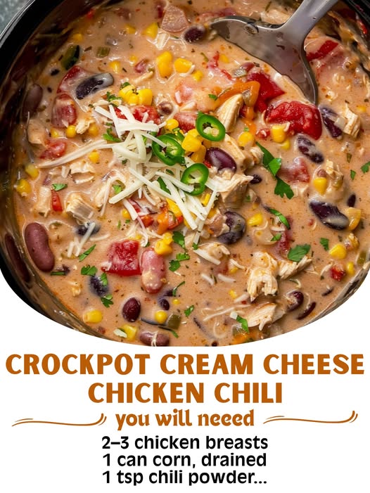 This Crockpot Cream Cheese Chicken Chili is the ultimate cold-weather comfort food! Packed with tender shredded chicken, hearty beans, sweet corn, and bold Tex-Mex spices, it’s made irresistibly creamy with a full block of cream cheese. Just toss everything in the slow cooker and let it simmer to perfection. Serve with your favorite toppings for a warm, satisfying bowl of goodness!