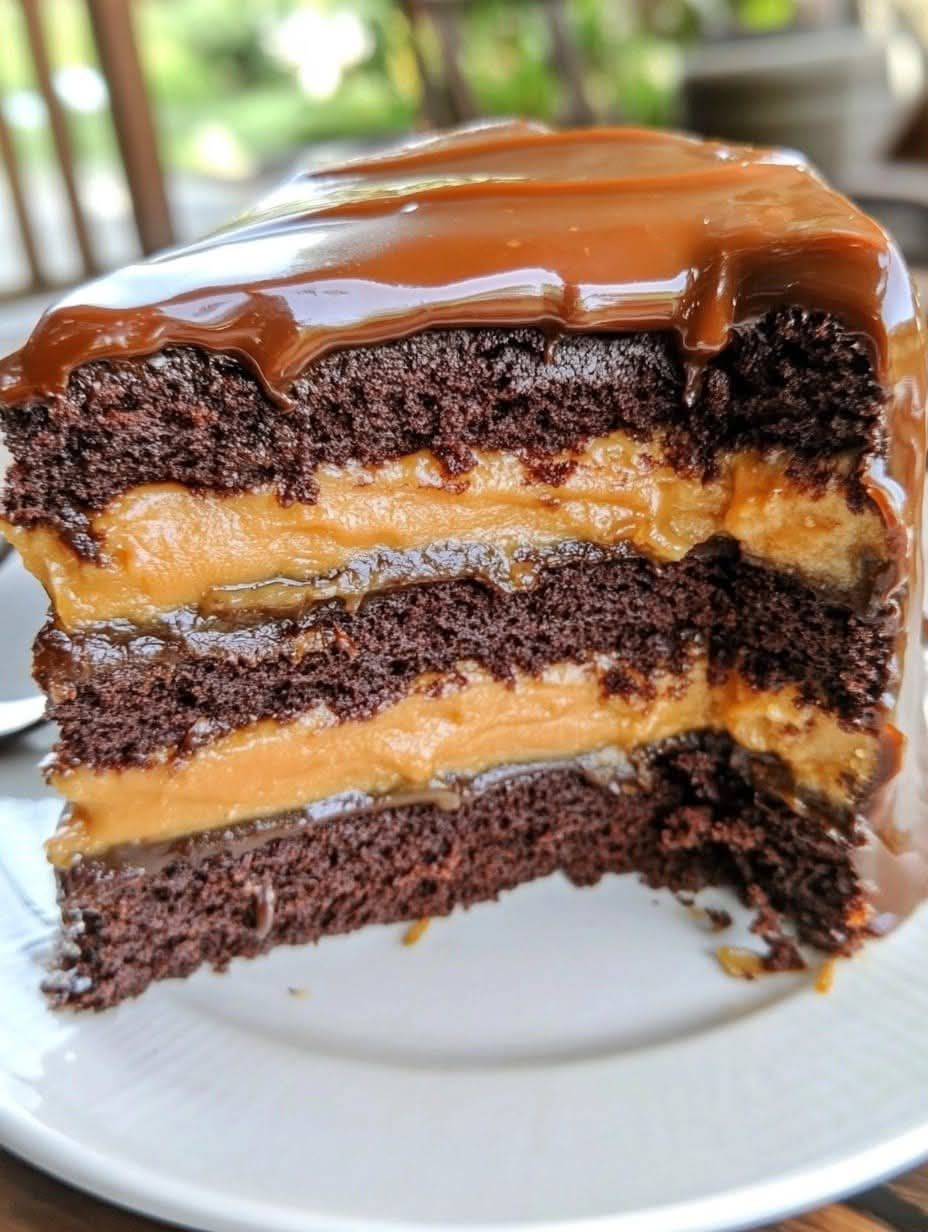 Decadent Chocolate and Dulce de Leche Layer Cake — rich, moist chocolate layers filled with creamy dulce de leche and finished with a glossy chocolate ganache. This indulgent dessert is perfect for celebrations or whenever you crave something truly luxurious! 🎂🍯🍫