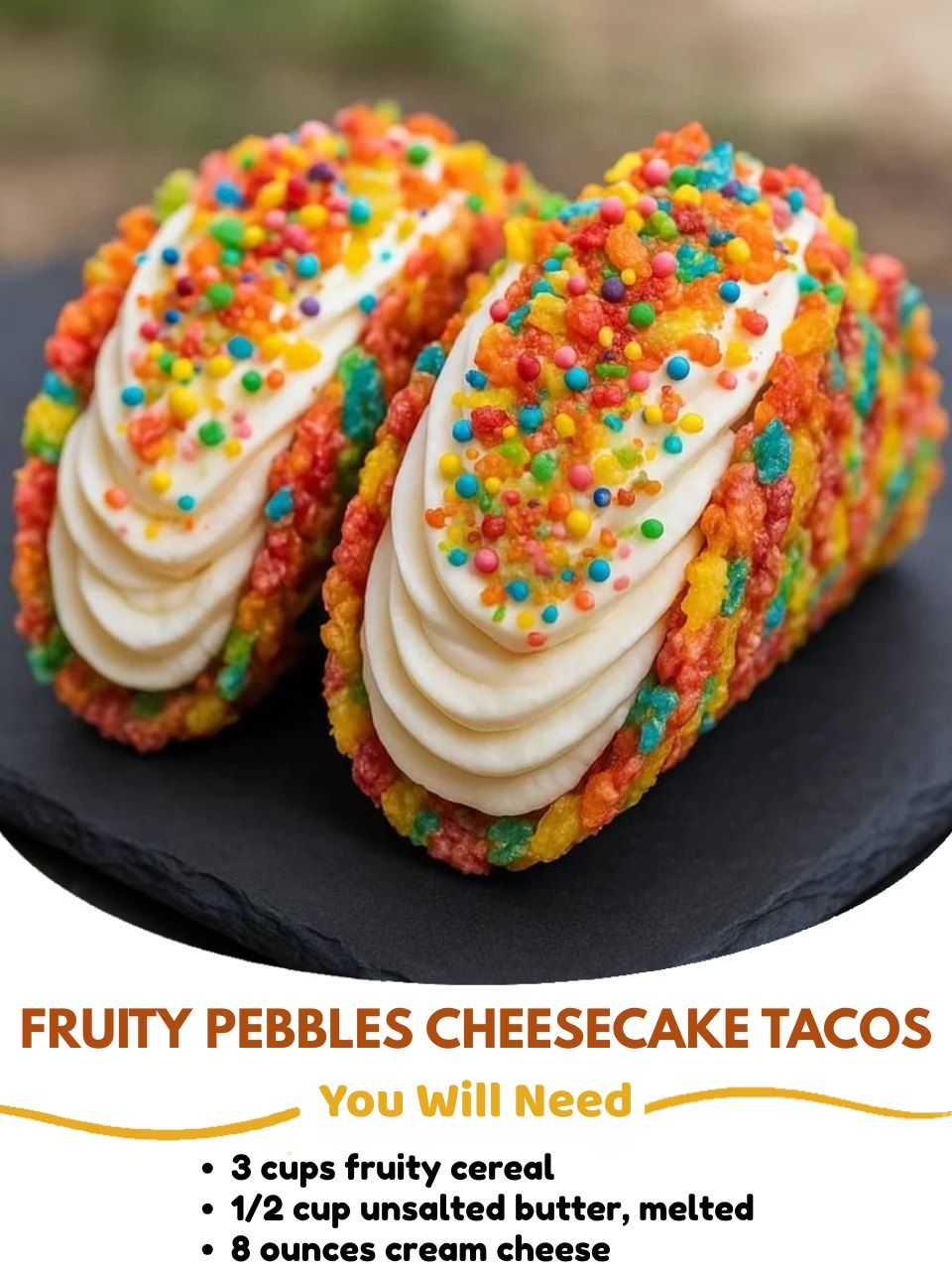 These Fruity Pebbles Cheesecake Tacos are a colorful, no-bake treat that perfectly blends crunch, creaminess, and fun. With crispy cereal taco shells filled with a smooth, sweet cheesecake filling and topped with vibrant cereal pieces, each bite delivers a mix of textures and nostalgic flavor. Ready in under an hour, they’re ideal for parties, birthdays, or whenever you need a whimsical dessert that stands out.