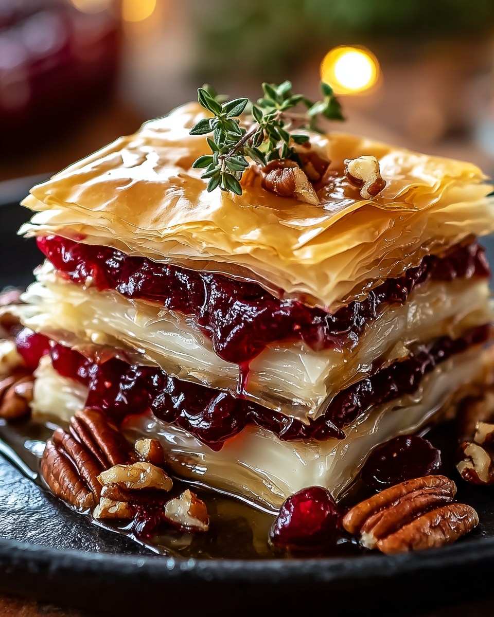 🧀🍒 Impress your guests with these festive Golden Phyllo Stacks filled with creamy brie, sweet-tart cranberry sauce, and toasted pecans! Every bite delivers an irresistible contrast of crispy, gooey, nutty, and tangy — a dazzling appetizer or elegant bite-sized dessert for your holiday spread. With minimal effort and maximum impact, these stacks are as showstopping as they are delicious.