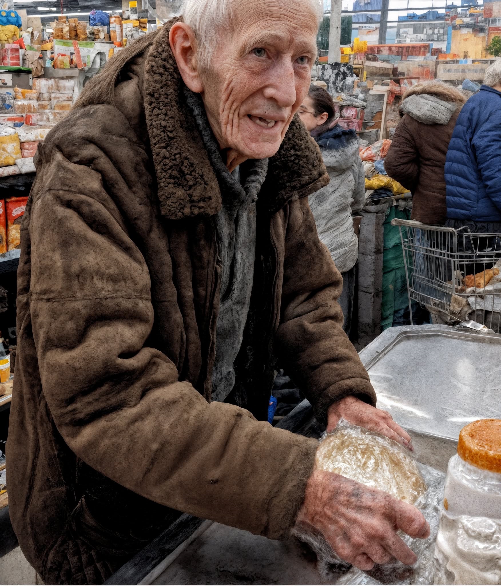 The old man’s face turned a bright red, embarrassed. He looked down at the counter, his shoulders hunching as if he were trying to disappear into his coat.