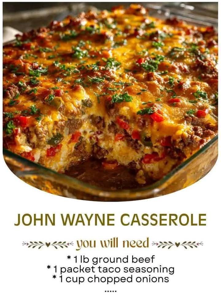 John Wayne Casserole is a hearty, flavor-packed dish with Southwestern flair. Layered with seasoned ground beef, onions, peppers, tangy tomatoes, and a creamy cheesy topping over a tender biscuit base, this crowd-pleasing casserole is bold, comforting, and cowboy-approved!
