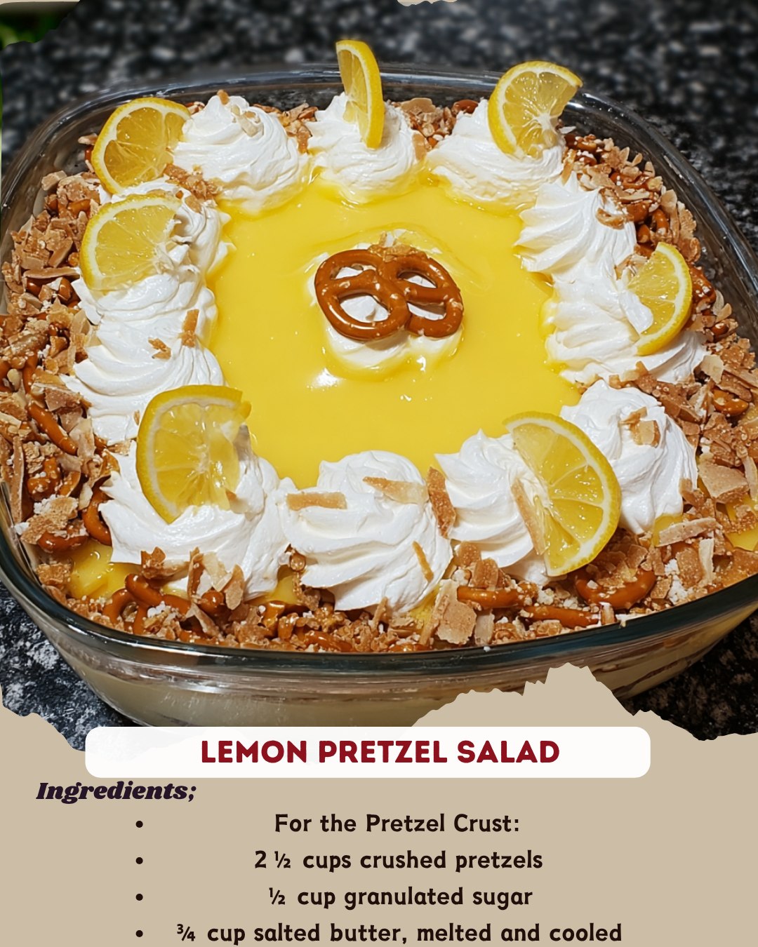 Lemon Pretzel Salad is a classic layered dessert that perfectly balances sweet, tangy, creamy, and crunchy in every bite. A buttery pretzel crust provides a salty crunch, topped with a light and fluffy cream cheese layer, then finished with a bright, glossy lemon topping. Chilled until set, this dessert slices beautifully and is always a standout on dessert tables, potlucks, and holiday spreads.