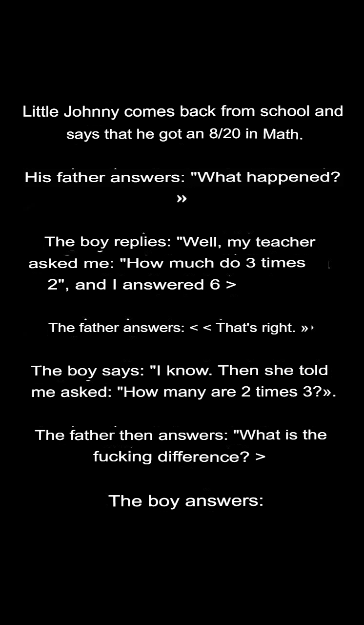 Why can the simple act of multiplying two numbers cause so much confusion? For a little boy, mathematics took a particularly comical turn. Imagine coming home with an 8 out of 20 in math and having to explain to your father that « 3 times 2 » and « 2 times 3 » aren’t quite the same… according to the teacher! The ensuing humorous exchange between father and son is a perfect nod to the little absurdities of everyday life.