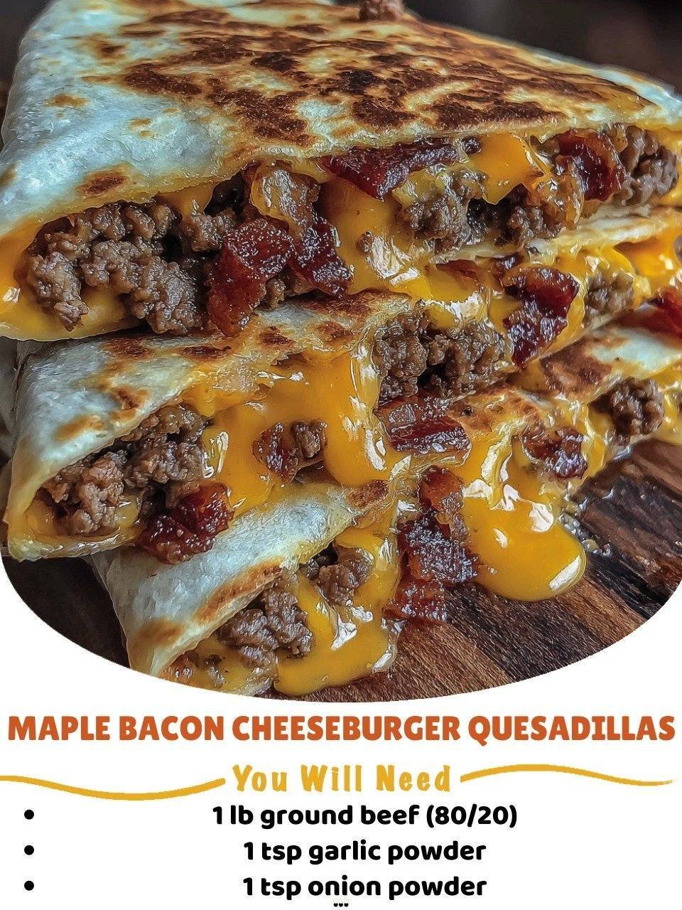 Maple Bacon Cheeseburger Quesadillas — the ultimate sweet-and-savory fusion! Crispy golden tortillas filled with juicy seasoned beef, smoky maple bacon, and melted cheese. Every bite delivers gooey, crispy, cheesy perfection — the best parts of a cheeseburger and quesadilla combined. 🧀🔥🍁