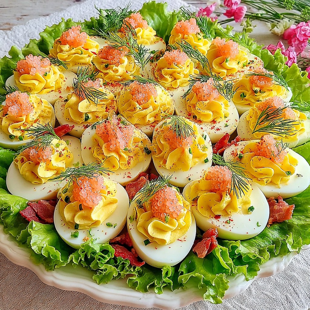 🥚✨ These Mimosa Eggs with Salmon Caviar & Crispy Bacon are an elegant twist on the classic deviled egg — creamy, smoky, and topped with a luxurious spoonful of roe. The perfect bite-sized appetizer for festive gatherings, brunches, or special occasions. The smoky bacon adds crunch, the caviar brings a pop of briny richness, and the fresh herbs elevate every bite.