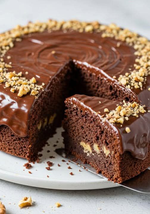 A rich and moist chocolate cake with the perfect crunch of walnuts, topped with smooth chocolate ganache. Perfect for any occasion!