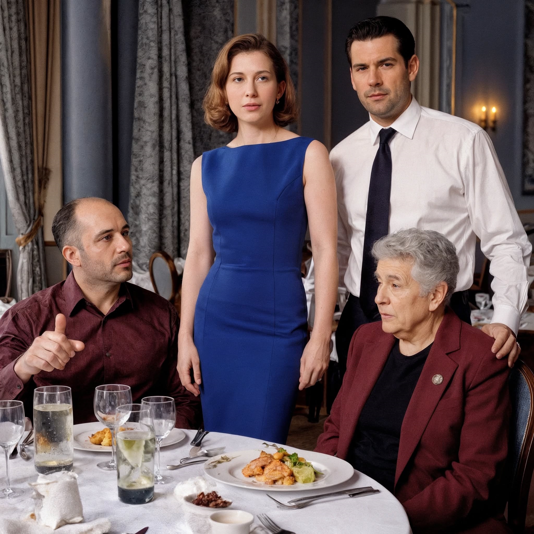 I walked in. The room was full of people, laughter, and the clinking of glasses. I moved slowly between the tables and, suddenly, I saw them. Pavel was enthroned at the head of the table, next to Tamara Petrovna, in a burgundy suit, and her sister Marina with her husband. On the table were empty plates, glasses, and leftover dessert.
