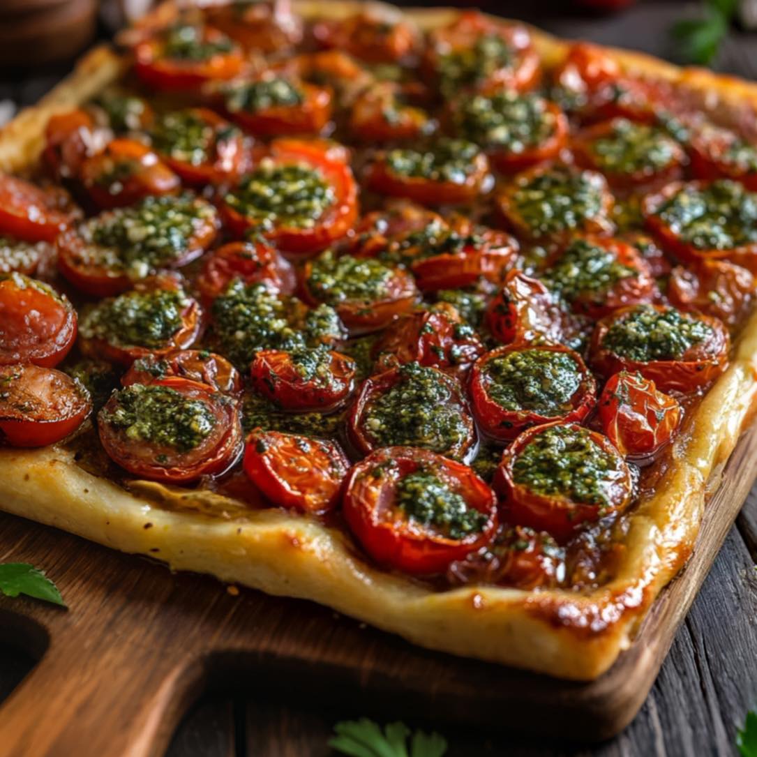 This Pissaladière with Candied Tomatoes and Pesto is a vibrant twist on the classic French tart — featuring a tender, golden crust, rich pesto base, sweet roasted tomatoes, and melty cheese. It’s perfect as a starter, light meal, or impressive appetizer, served warm or at room temperature with a glass of chilled rosé. 🍅🧀🍷