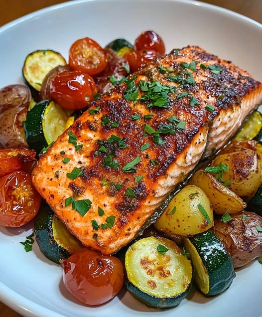 This Roasted Salmon with Summer Veggie Medley is a vibrant, nutrient-rich one-pan meal that’s easy enough for weeknights yet elegant enough to serve guests. With golden baby potatoes, juicy blistered cherry tomatoes, and lightly caramelized zucchini, it’s a balanced dish where every component is seasoned and roasted to perfection—then brought together by the warmth of olive oil, herbs, and tender, flaky salmon.