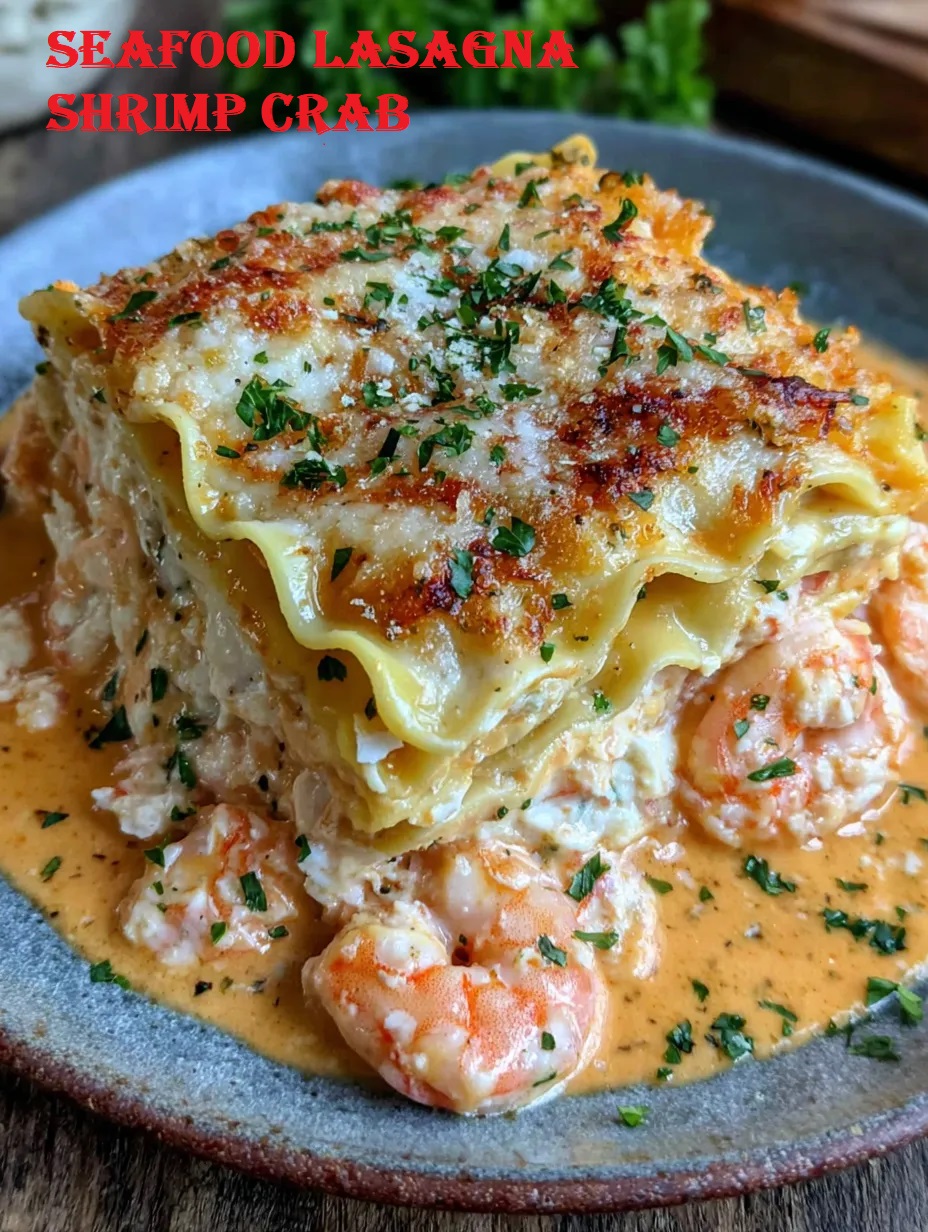 Layers of shrimp, crab, and cheese with creamy Alfredo sauce and crunchy topping, baked until bubbly.