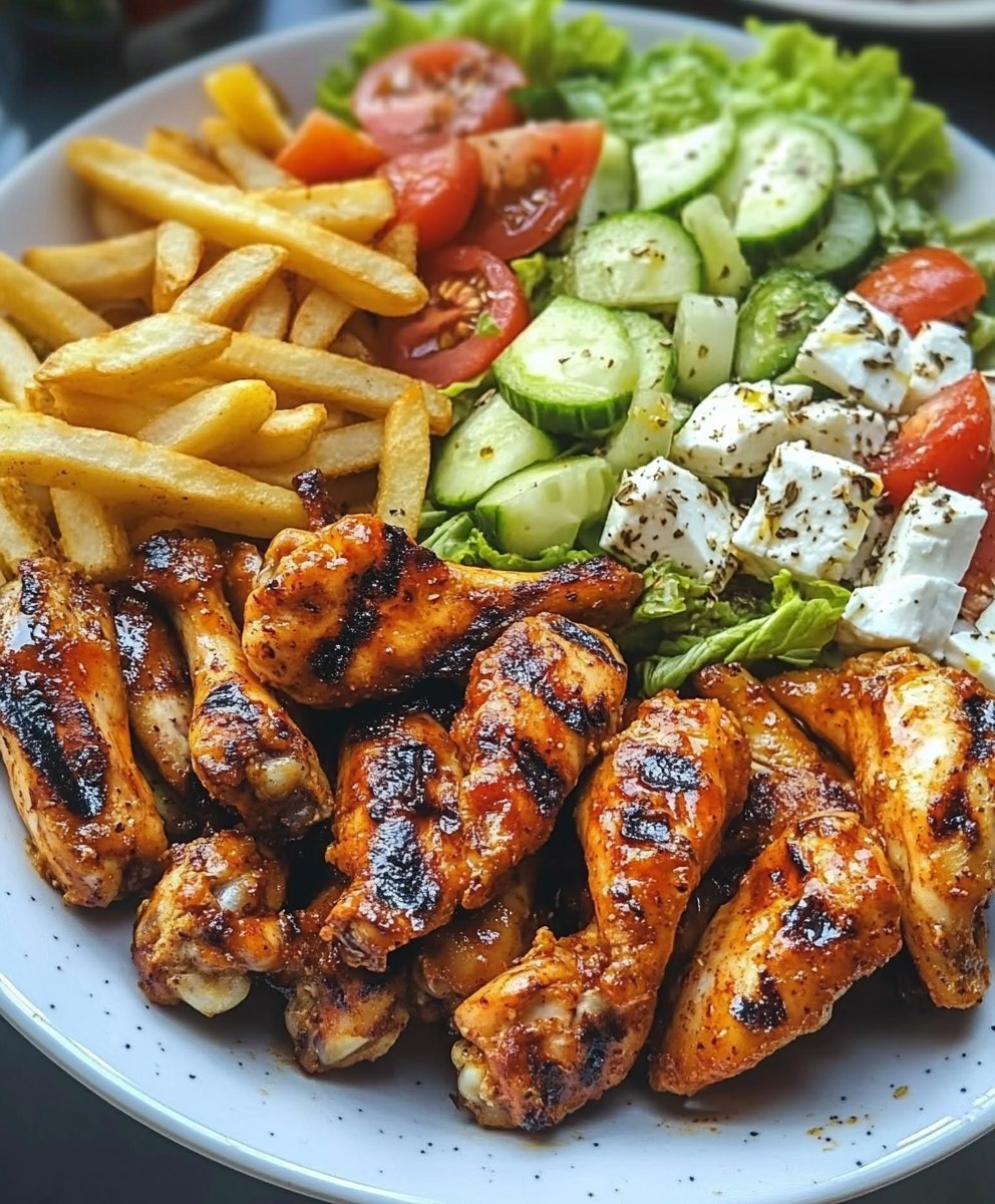 🔥 Spicy Grilled Chicken Wings with Homemade Fries & Greek-Style Salad 🍟🥗