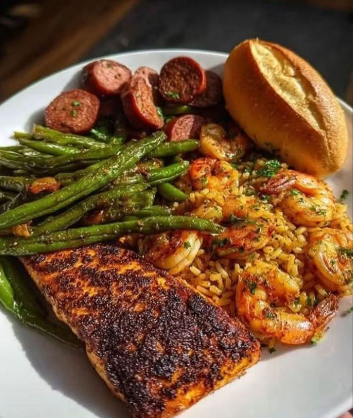 This full-flavor Southern plate is a delicious homage to Louisiana comfort food. Featuring blackened fish, shrimp and sausage-loaded Creole rice, sautéed garlic green beans, and a warm buttery roll on the side — it’s a hearty, satisfying meal with bold Cajun flair!