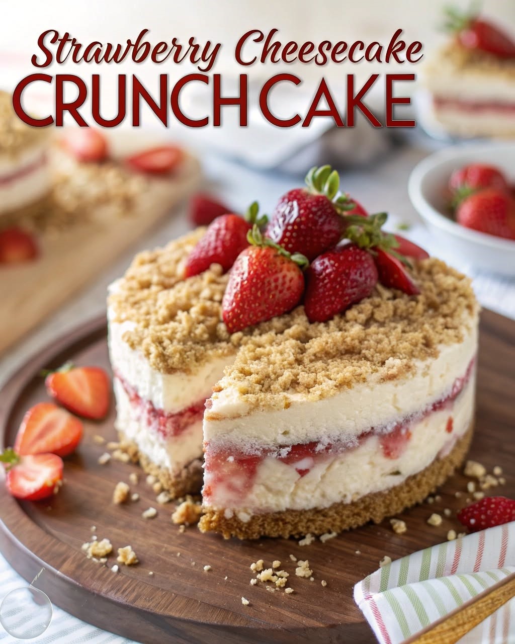 This dreamy Strawberry Crunch Cake is layered with strawberry cake, a creamy cheesecake center, and a rich cream cheese frosting—all topped with a buttery cookie crunch that tastes just like childhood summer. It’s the perfect dessert for birthdays, BBQs, or any occasion that calls for a sweet, fruity indulgence.