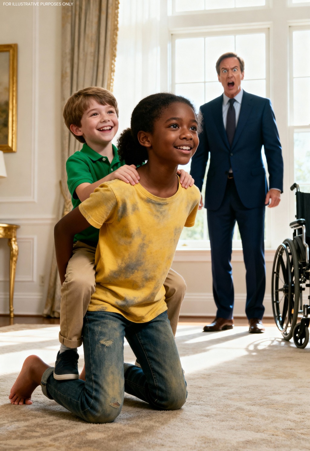 He crept forward and paused at the doorway. On the Persian rug a girl with messy auburn hair and a faded green dress crawled on all fours. Oliver sat astride her back, holding her shoulders as he roared with joy. His wheelchair had been pushed aside and forgotten.