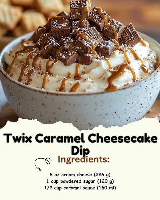 This Twix Caramel Cheesecake Dip is a sweet and indulgent treat that’s perfect for any occasion. With creamy cream cheese, rich caramel sauce, and the irresistible crunch of Twix candy bars, this dip is a crowd-pleaser that’s easy to make and even easier to enjoy. Whether you’re serving it at a party or for a casual snack, it’s sure to be a hit!