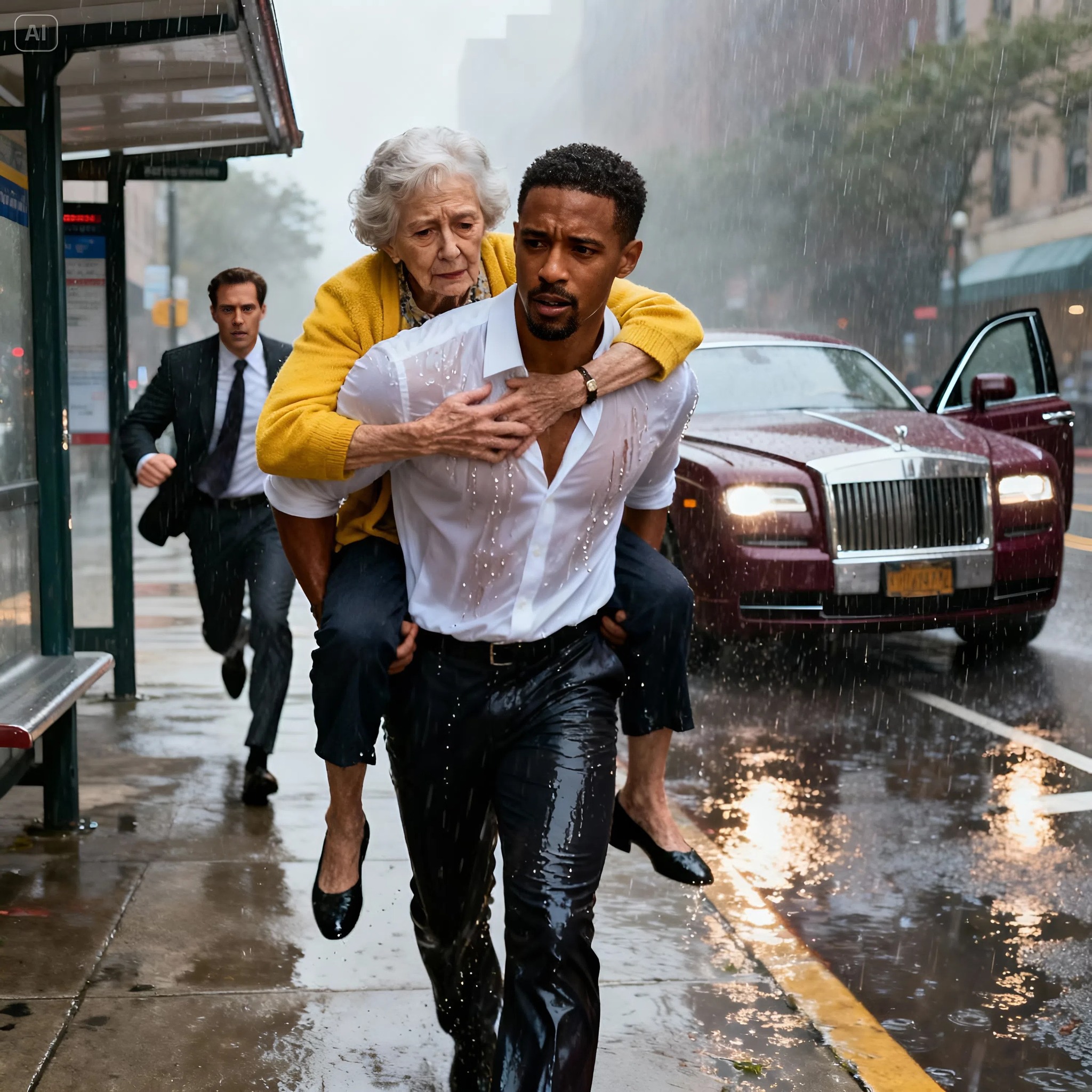 Approaching the building again, he saw a black luxury car parked before the glass doors, its engine humming smoothly, contrasting sharply with the storm’s fading growl across city rooftops.
